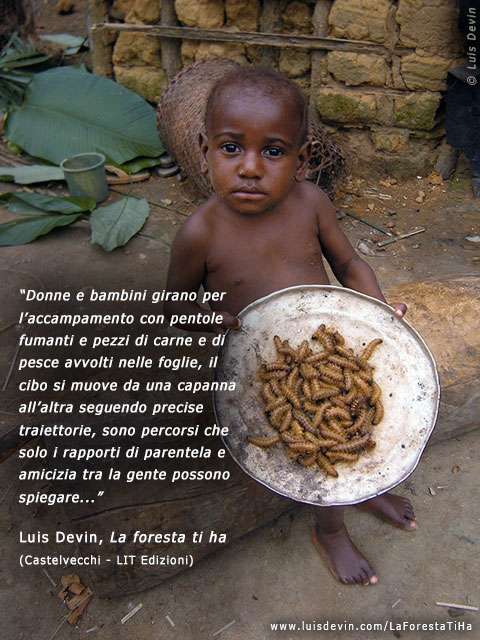 FOTO: Bambino Baka con bruchi commestibili (Pigmei Baka, Gabon). PAESAGGIO SONORO: crepitio delle scaglie di un pangolino bruciate sul fuoco. In sottofondo, rumori dell'accampamento (Pigmei Baka del Camerun) "Donne e bambini girano per l'accampamento con pentole fumanti e pezzi di carne e di pesce avvolti nelle foglie, il cibo si muove da una capanna all'altra seguendo precise traiettorie, sono percorsi che solo i rapporti di parentela e amicizia tra la gente possono spiegare..." Luis Devin, La foresta ti ha (Castelvecchi - LIT Edizioni) |
